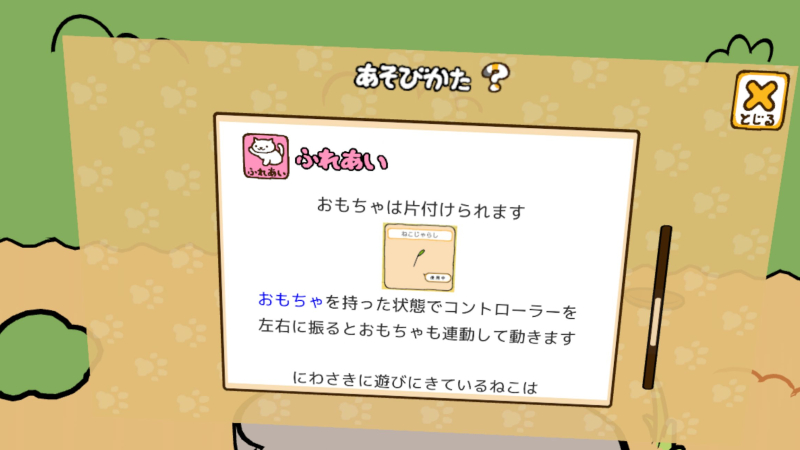 これはチュートリアルになかったが、VR限定機能として猫じゃらしがあり、振ると遊んでくれるらしい。
